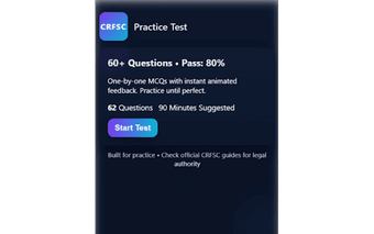 การทดสอบการฝึกอบรม CRFSC (สมัยใหม่) เป็นส่วนขยาย Chrome ฟรีที่ออกแบบมาเพื่อช่วยผู้ใช้ในการเตรียมตัวสำหรับการสอบหลักสูตรความปลอดภัยของอาวุธปืนที่จำกัดของแคนาดา (CRFSC) โดยมีคำถามแบบเลือกตอบมากกว่า 60 ข้อที่สะท้อนรูปแบบการสอบจริง เครื่องมือนี้มอบประสบการณ์การศึกษาที่ครอบคลุม ผู้ใช้สามารถคาดหวังข้อเสนอแนะแบบทันที สรุปคะแนนสุดท้าย และอินเทอร์เฟซที่ใช้งานง่ายซึ่งช่วยเพิ่มการเรียนรู้